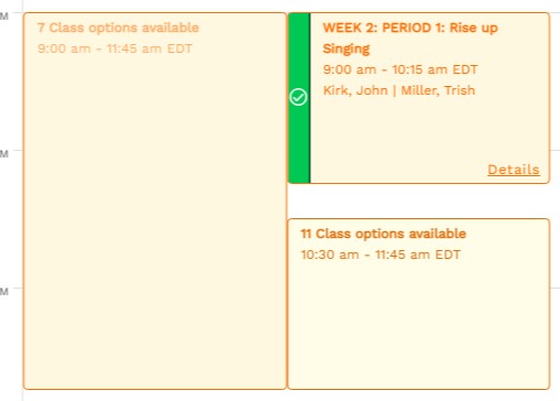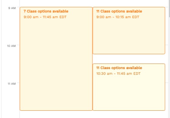 Look for your desired class based on the time period. In the example below, the LEFT rectangle represents 2-pd classes running from ix-11:45 AM. The UPPER Correct rectangle represents Period ane classes and the LOWER RIGHT rectangle is Menstruation two classes. You tin can whorl down to see the blocks representing classes in the remaining periods.